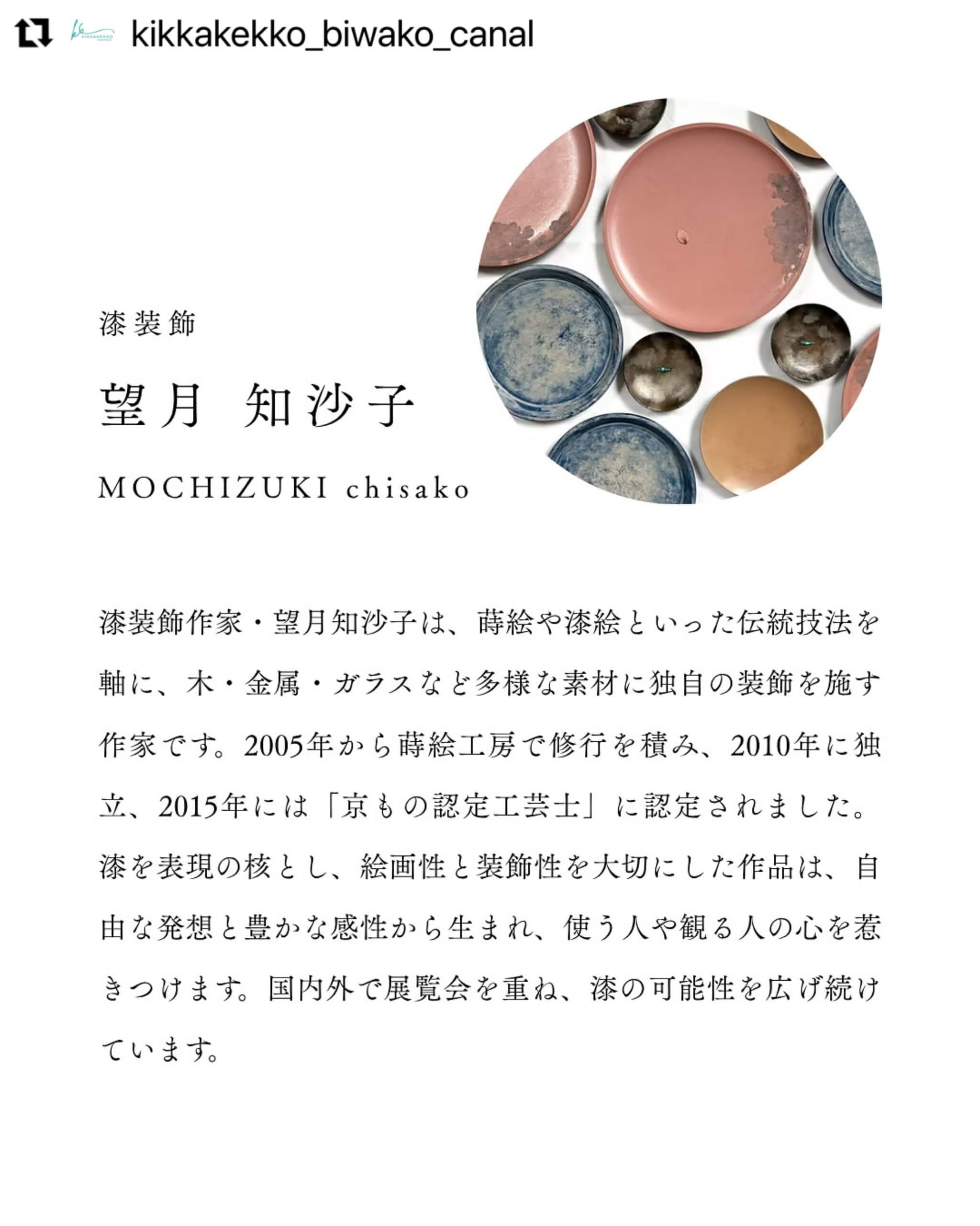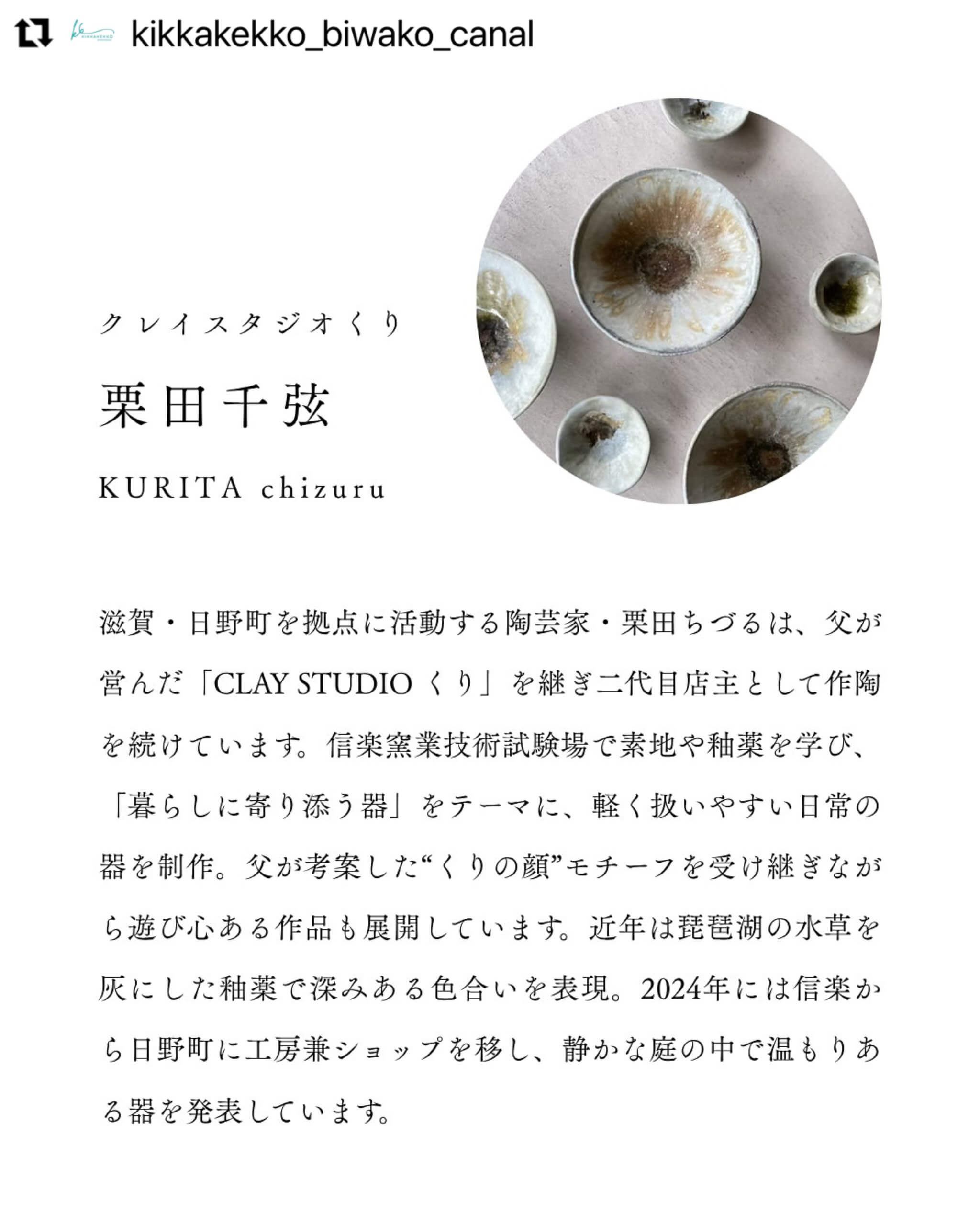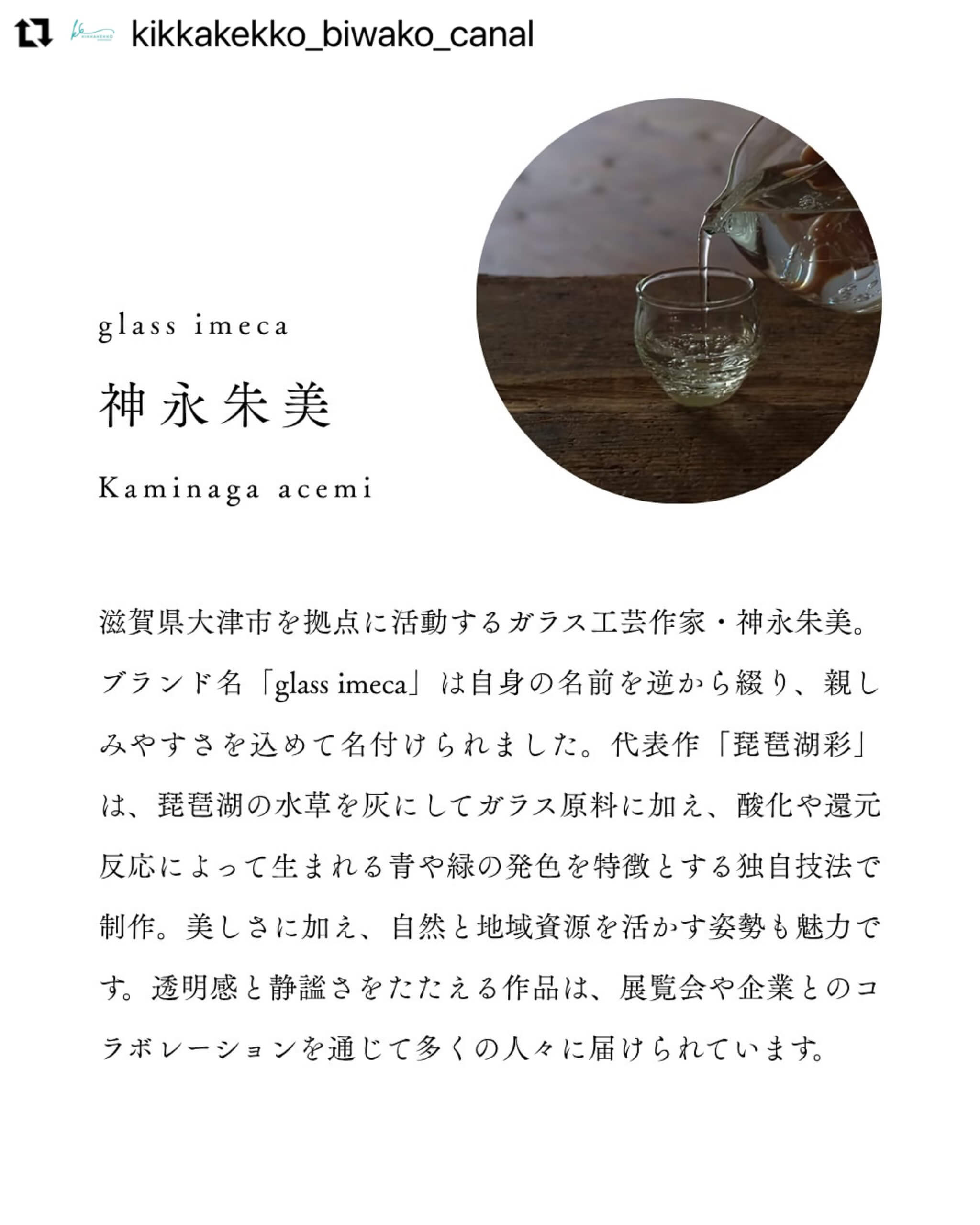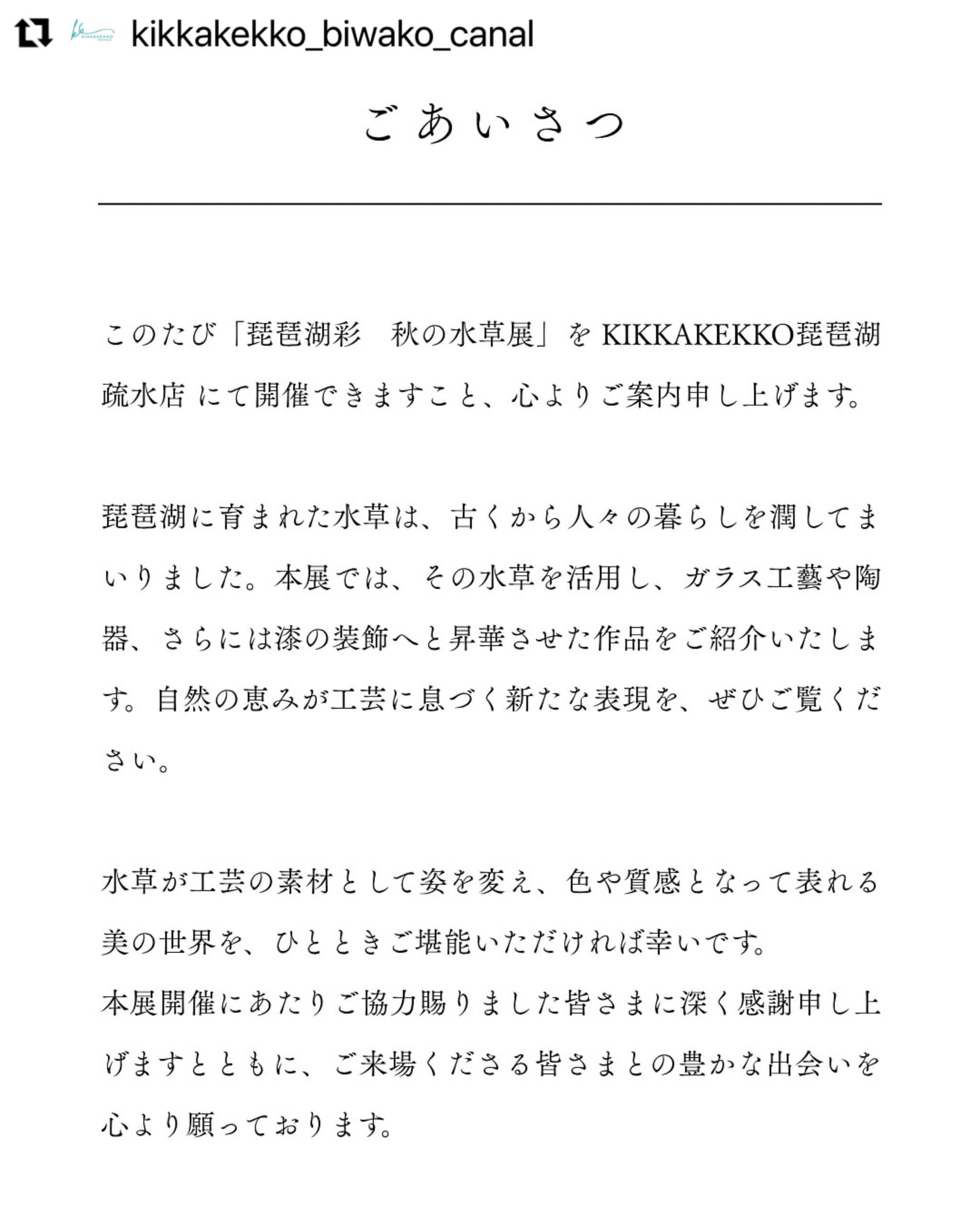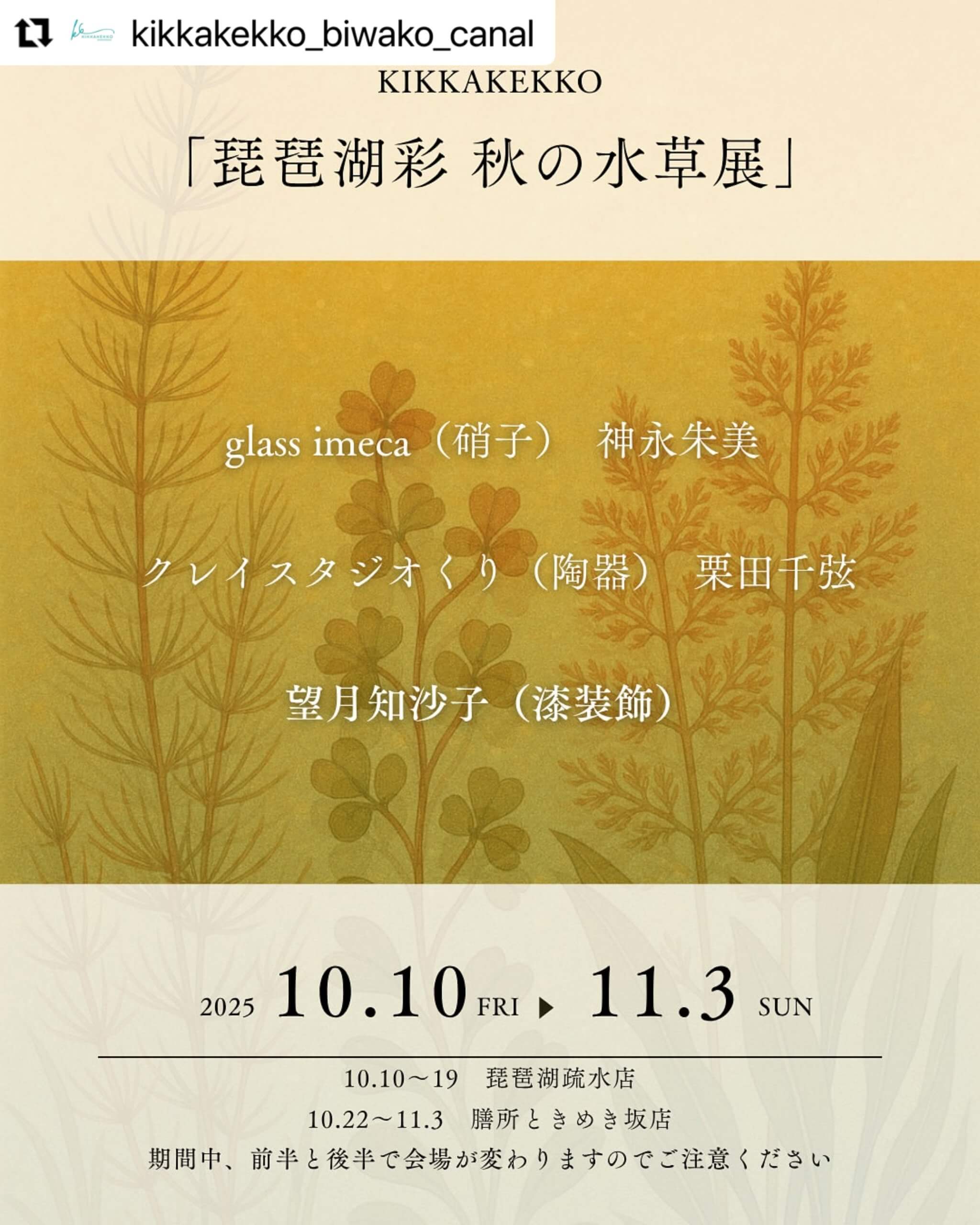 2025.10.08 琵琶湖彩 秋の水草展 10/10からは、キッカケッコ琵琶湖疎水店の企画展に参加します☺︎ 琵琶湖の水草シリーズ色々作りました。 定番の花入や栗の豆皿なども少しお待ちします。 10/12には大津祭りが開催されます。ニュースでしか見たことないけど、曳山と、からくり人形が見ものの賑やかなお祭りのようです。見たい!! お祭り見物の合間にぜひご覧くださいませ。 #Repost kikkakekko_biwako_canal ・・・ 🍂 「琵琶湖彩 秋の水草展」開催のお知らせ ガラス、陶器、漆――3名の作家による、滋賀の自然と手仕事が響き合う秋の展示会を開催します。 琵琶湖の水草を活かした独自の技法や、日々の暮らしに寄り添う器、絵画的な漆の表現など、それぞれの素材が持つ美しさと静けさをお楽しみください。 📍KIKKAKEKKO 琵琶湖疏水店膳所 🗓 2025.10.10〜10.19 📍KIKKAKEKKOときめき坂 2025.10.22〜11.3 ※前半と後半で会場が異なりますのでご注意ください。 Tweet Share RSS ROVAさんでの個展ありがとうござ... 10月の営業予定変更します。