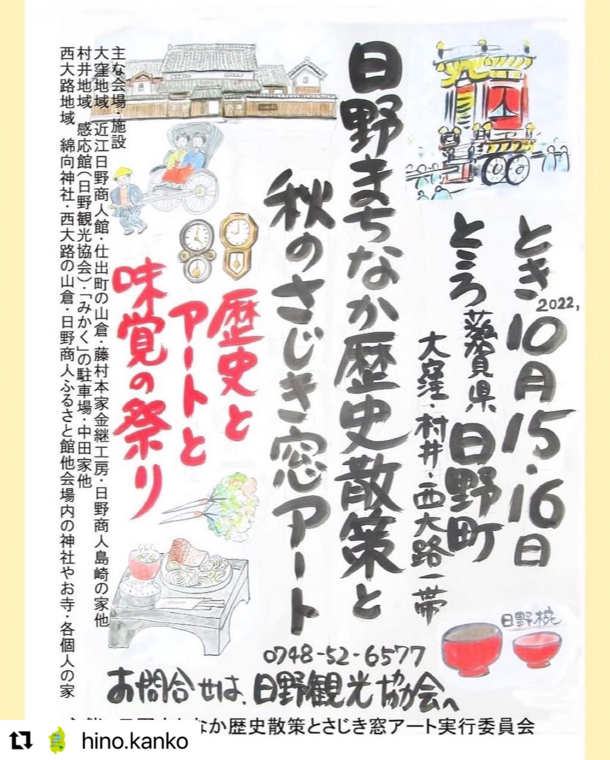 2022.10.14 10/15、16は日野の桟敷窓アートです。 この週末は日野の桟敷窓アートです。 久々の開催、準備してるみなさんも嬉しそう☺︎ 明日土曜日は母が店番、日曜日は1日店主くりたがお待ちしています。 ⚠️10/16(日)信楽の店はお休みです ぜひ遊びに来てください! #Repost @hino.kanko ・・・ 3年ぶり、20回目の開催! 「日野まちなか歴史散策と秋の桟敷窓アート」 主催 日野まちなか歴史散策と秋の桟敷窓アート実行委員会 昭和の初期にタイムスリップしたような、懐かしい町並みの中で 甦った日野椀展示販売をはじめ木工・草木染・陶芸・ 写真ほか個性的な作品を展示。 アコースティックコンサートや日野曳山の公開、祭囃子演奏など見どころいっぱいです。 それぞれの催し物など、順次ご紹介いたします🍁 【期日】 10月15日(土)~10月16日(日) 午前9時30分~午後5時00分 【場所】 日野町大窪~村井・西大路にかけての商家・商店他 ※イベント会場近くには駐車場が少ないため、なるべく公共交通機関をご利用ください。 また、10月16日(日)は日野駅舎5周年イベントが開催!近江鉄道ありがとうフェスタで、近江鉄道も全線無料です🚃ぜひ、日野駅とあわせて日野のまちなかへお出かけください♫ 「お問い合わせ先」 〒529-1604滋賀県蒲生郡日野町村井1284番地 日野観光協会事務局 電話0748-52-6577 FAX0748-52-6017 Tweet Share RSS ユキアカリ名残の月ありがとうござい... 10/15営業日です。