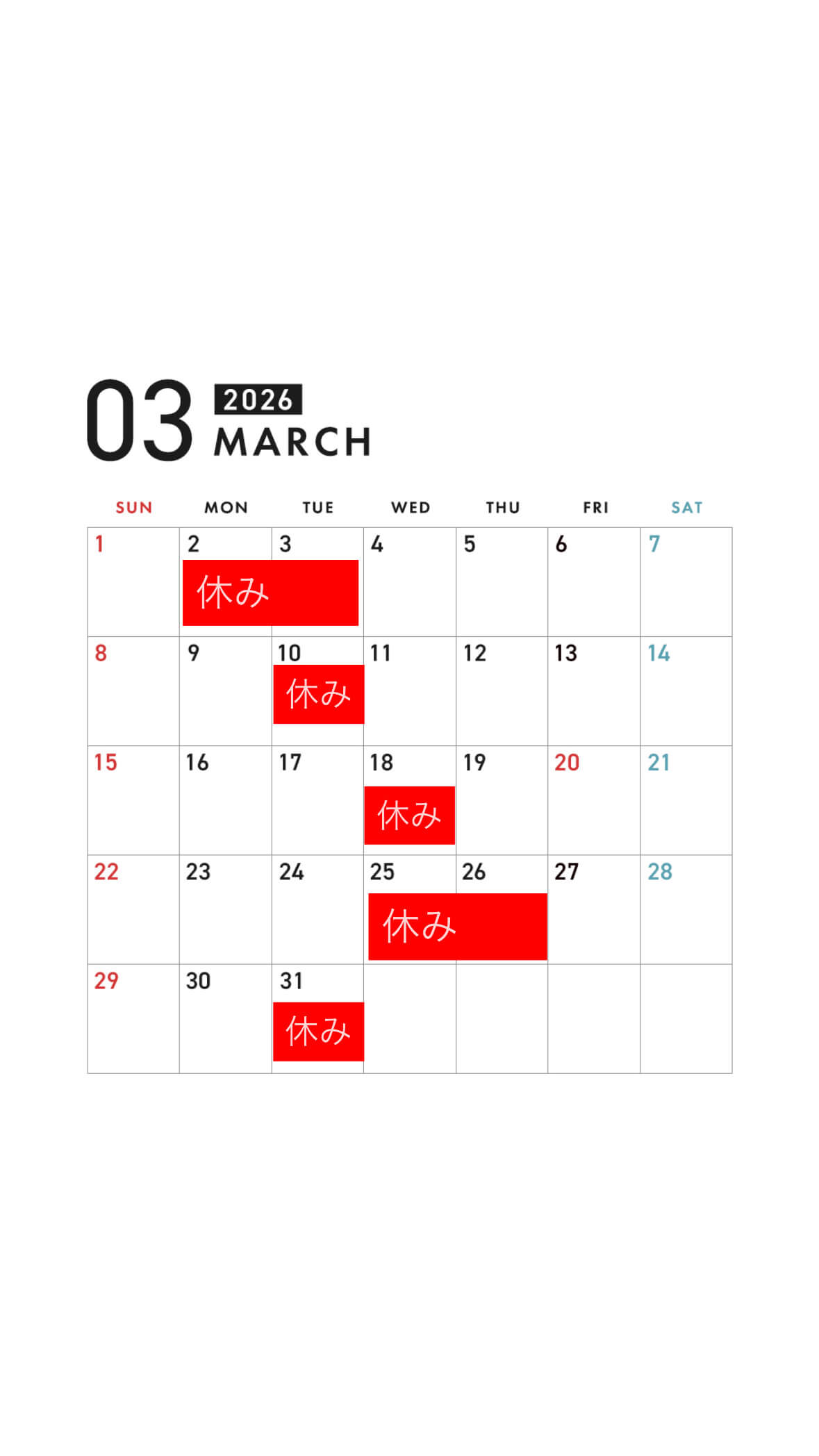 2026.02.22 3月の営業予定。 3月の営業カレンダーです。 3月は、社会科見学的な出稼ぎ(笑)に三日間ほど行きます(妹の仕事先の教科書販売のバイト) 平日の休み多めでご迷惑をお掛けします。 どうぞよろしくお願いします。 2日(月) 休み 3日(火) 休み 10日(火) 休み 18日(水) 休み 25日(水) 休み 26日(木) 休み 31日(火) 休み 上記以外は11:00〜18:00営業です。 うちの店がある日野町村井〜大窪地区では、3/8(日)までひなまつり紀行を開催しています。 ジャパンコーヒーフェスティバルなど楽しみな催しがたくさんです。 ぜひお立ち寄りください☺︎ Tweet Share RSS 2月の営業予定。